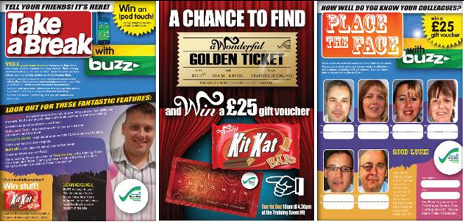 Competitions included a ‘Find the Golden Ticket’ incentive, which aimed to encourage people to attend their drop-in sessions. Staff could win vouchers if they picked the winning chocolate bar out of a box. Teaser posters kept the competition fresh and made sure the new intranet was kept in peoples minds. Their innovative ‘Place the Face’ competition was designed to get staff used to looking at Buzz to get to know their colleagues by face.