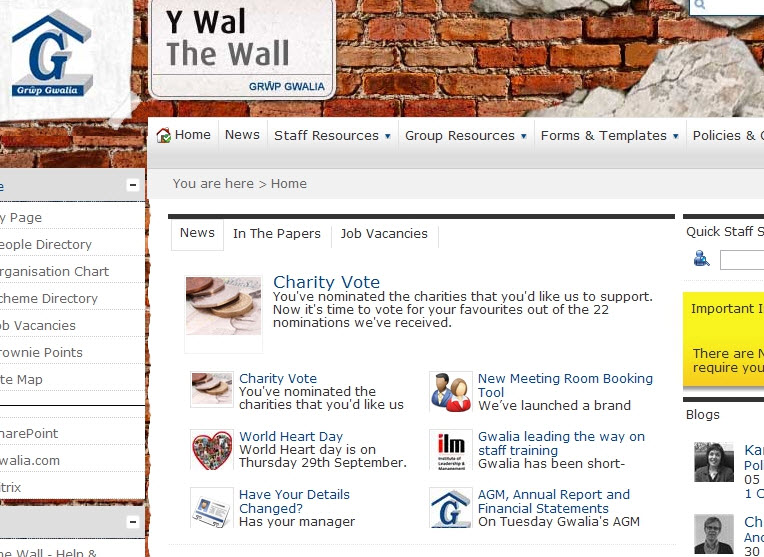 Gwalia ensured staff were engaged in their intranet – The Wall from the outset. They implemented an online and SMS text vote, in the style of X Factor to decide on the name for their intranet and carried out card sorting exercises with staff to decide on the content structure. This drove high levels of intranet adoption, with 83% (and still growing) of all staff having read the intranet in the last 30 days when they entered the awards.