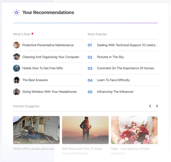 Interact’s AI-driven recommendation engine helps identify new content that employees should know about, ensuring that crucial updates are never overlooked. By incorporating real-time communication channels that alert employees to changes and updates—which employees can customize based on their needs and preferences—intranets enable organizations to thread communication throughout the employee journey, enhancing engagement and alignment at every touchpoint.